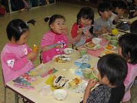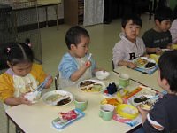 給食を食べました。お兄ちゃん・お姉ちゃんのまねっこで、大きな口をあけてモグモグ食べました。「おいしいねぇ