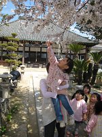 先生に抱っこしてもらって、お花にタッチ