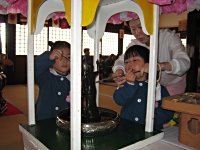 お釈迦様に甘茶をかけます。「お誕生日おめでとうございます。」
