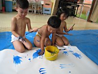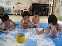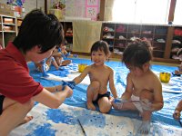 3歳児さんが絵の具をつかって“ボディーペインティング”をしました。