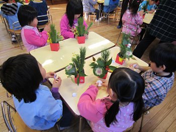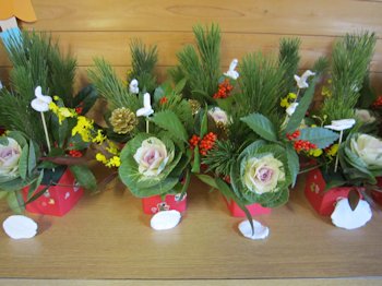お正月を迎える準備として、松、ハボタン、千両などの花材を使って生けました。