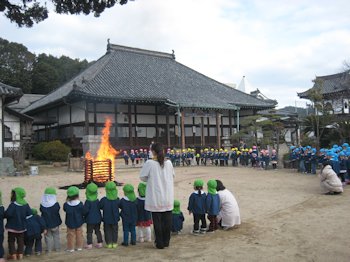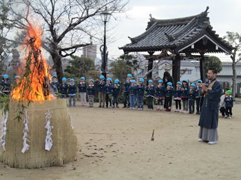園児全員が燃え上がる“とんど”の炎を見つめながら、