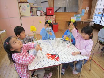自分で絵を描いた、紙コップの器に挿しました。 「茎が折れそう