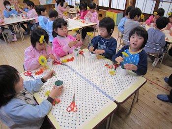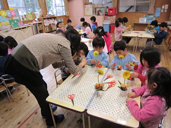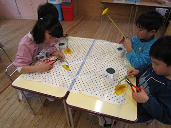 しるしを探して切ります。 「お花がつぶれないようにね!」
