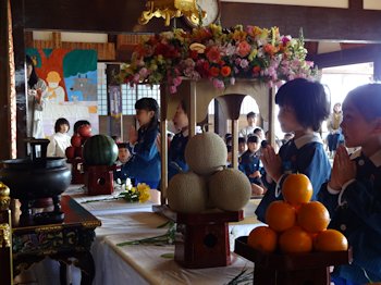 卒園児たちも参加しましたが、まかれた散華(さんげ)を間近に見て、