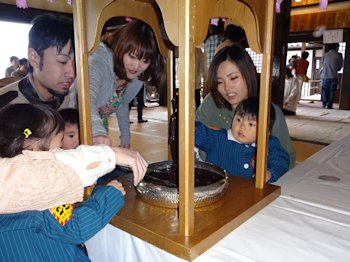 法要・お祈りが終わると、お家の方も一緒にお釈迦様に甘茶をかけました。