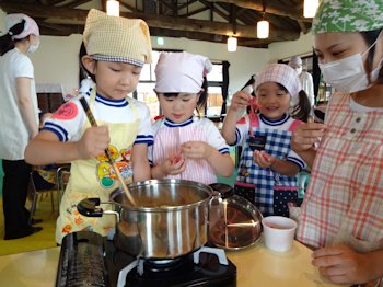 年長児さんの切った野菜とお肉を炒めて、お水を入れて…