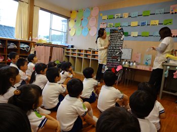 お迎えに来られたお家の人に、『お泊り保育』の話を次から次に話し始める子ども達。楽しい思い出と、お家の人と離れて集団生活ができたことで、自信いっぱいの様子でした