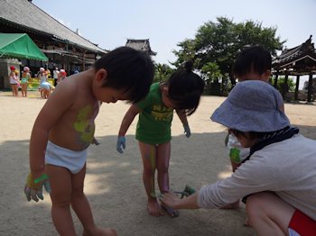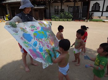 手に絵具をつけて、ペタペタ、ぬりぬり…