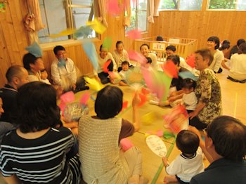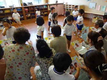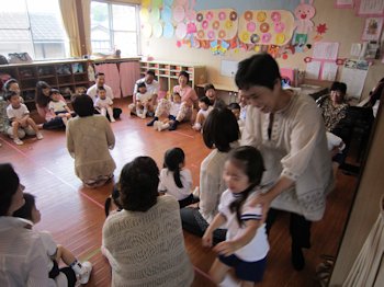 3才児 ハンカチ落としをしました。 「速く走って!」大興奮