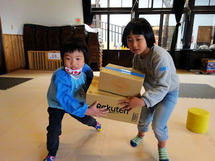 うさぎ組さんとはペアになって箱運び競走!