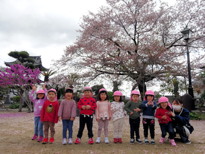 新しいピンク帽子のうさぎ組さん、桜の前で「ハイ、ポーズ📸」
