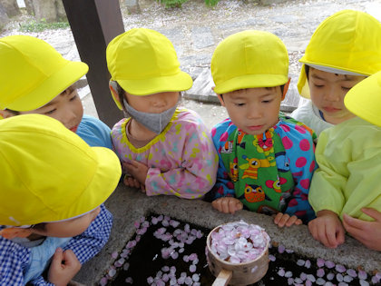 「桜の花びら、キレイだね~」うっとりと見つめる、きりん組さん💕