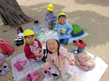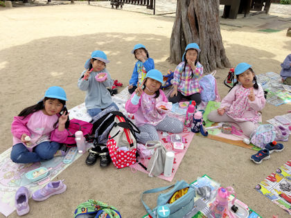 ぞう・きりん組は青空のもとで食べました。
