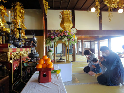 法要後は花御堂の前で各家庭ごとに手を合わせました。