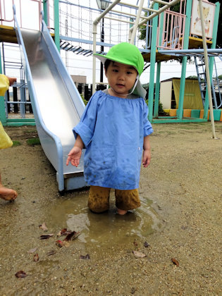 お外から「キャー!」とにぎやかな声が… 水たまりではしゃぐ、ぱんだ組さんでした。