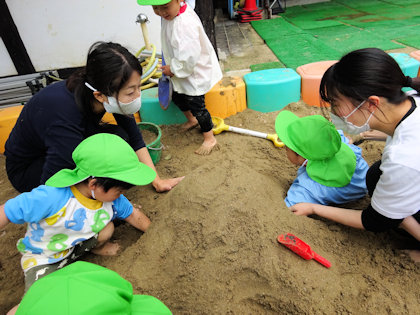 砂場では、大きなお山を作ってトンネルを掘りました。お友だちの手に届いたかなぁ?