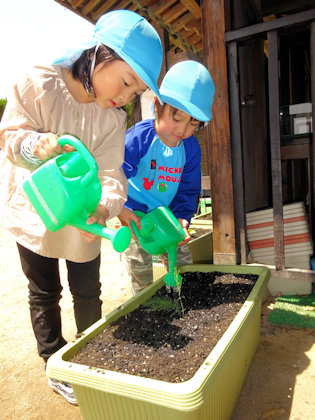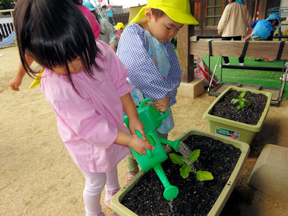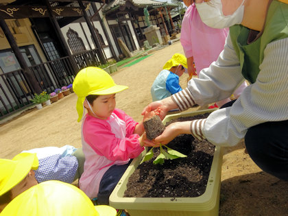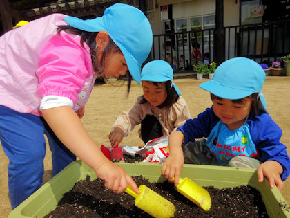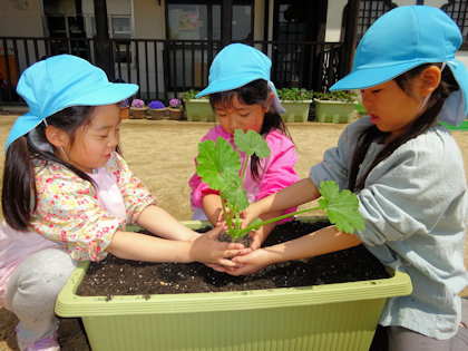 きりん組さんは初めての苗植え。お友達と協力して鉢にたくさんの土を入れていきました。