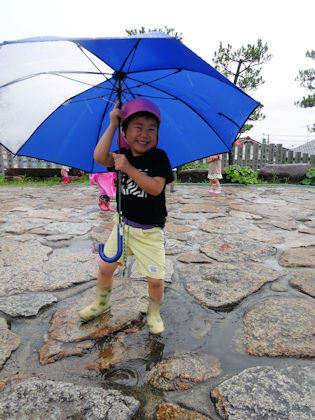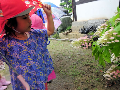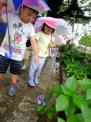 きれいな紫陽花を見たり、水たまりに入ってみたり、