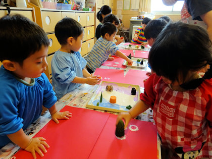 精霊まつりの団扇の制作もしました。先生とポンポン♫上手だね~💕