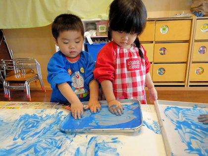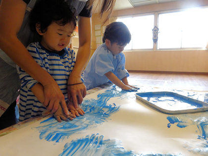 みんなの手形で大きなクジラの壁面画を作りました。楽しかったね~(^^♪