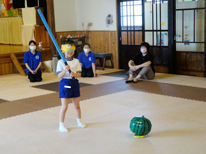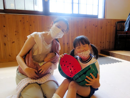 担当職員が準備したスイカ割りごっこ🍉 お母さんに目隠しをしてもらい…