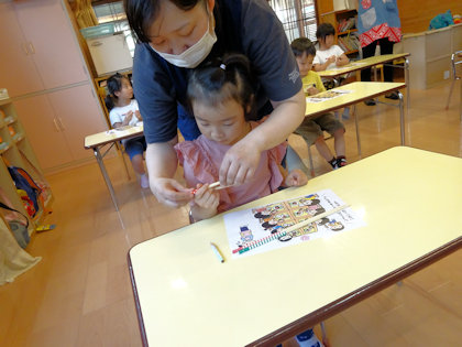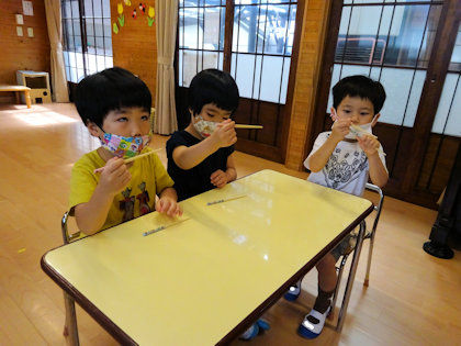 お皿の上にある小さなものを箸でつまんで移し替える練習をしました。みんな上手につまめていました😊