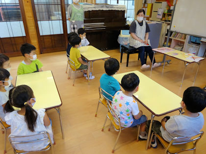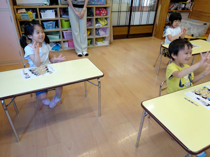 きりん組では椅子の座り方を学びました。「足はブラブラして食べてもいい?」「ダメ―‼」