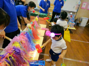 ぱんだ組さんが夢中になって筆を使っています。 ブルーシートに思いのままのびのびと… 大きなキャンパスを見に、小さな観客たちも集まってきました😊 手に絵の具を付けても楽しめることに気づいたようです。 手がみどりになったよ~ […]