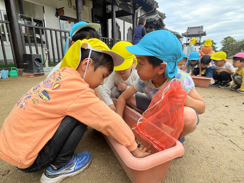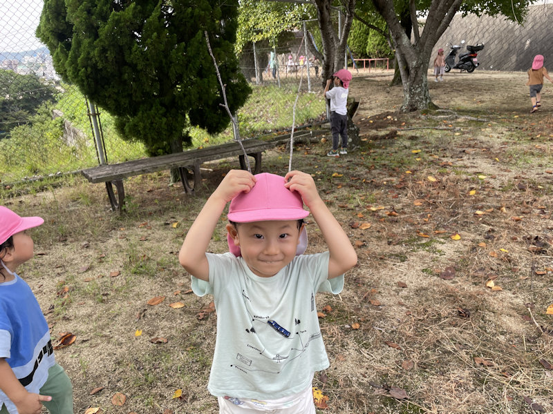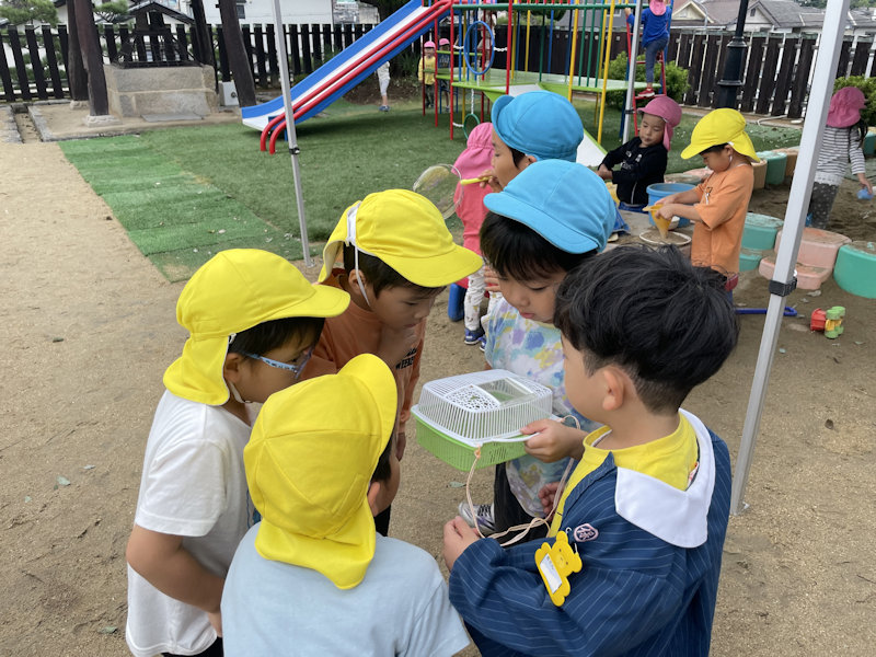 ぞう・きりん組さん、虫探しをしていました。副園長先生が捕まえたカマキリを見て大興奮😛