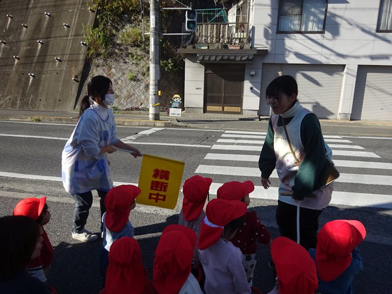 りす組さん 交通指導の実地訓練でお散歩へ。横断歩道を上手に渡ることが出来ました。